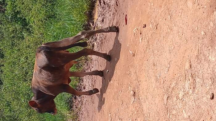 - "A lean, brown calf is observed walking from left to right across a reddish-brown dirt path under sunlight" by FM-wUCBi2, licensed under CC BY 4.0