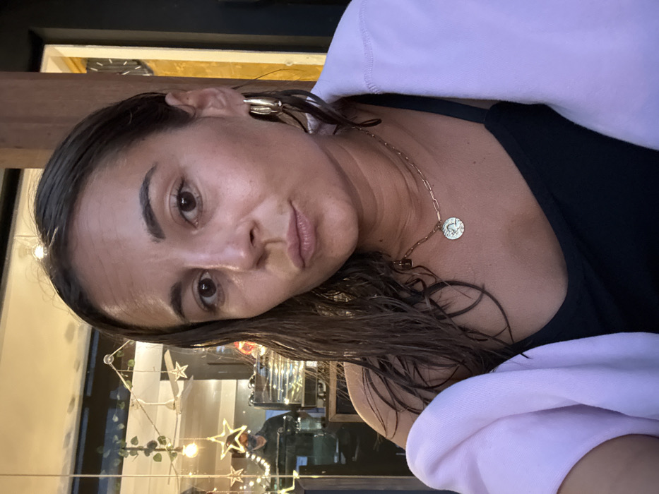 An adult female, appearing in her 20s or 30s, is positioned in the foreground, facing the camera directly in a close-up selfie. She has dark hair, which appears damp and hangs over her left shoulder. She is wearing a black top, a light pink garment draped over her shoulders, gold-toned hoop earrings, and a gold-toned layered necklace with a circular pendant. Her lips are slightly pursed. The background, visible through a glass partition and as a reflection, depicts the interior of a commercial establishment, likely a cafe or restaurant, located in Bentota, Sri Lanka. Decorative string lights with star-shaped and spherical bulbs, along with artificial greenery, are visible. A male individual, wearing a dark shirt and a dark face mask, stands behind the glass, partially obscured by equipment resembling a coffee machine. Artificial light sources illuminate the scene.