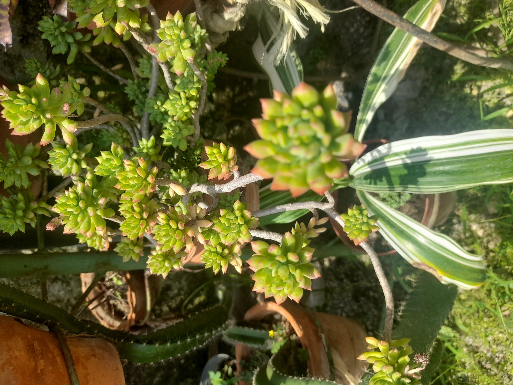 collection of succulents in Tinaquillo, Venezuela. A primary subject is a sprawling succulent with numerous small, green rosette-shaped clusters, edged in reddish-brown. This plant is in terracotta pots, amidst a green cactus with spines. Another plant with long, variegated green and white leaves is present in a pot. The scene is outdoors, with hints of grass and other plant life in the background.