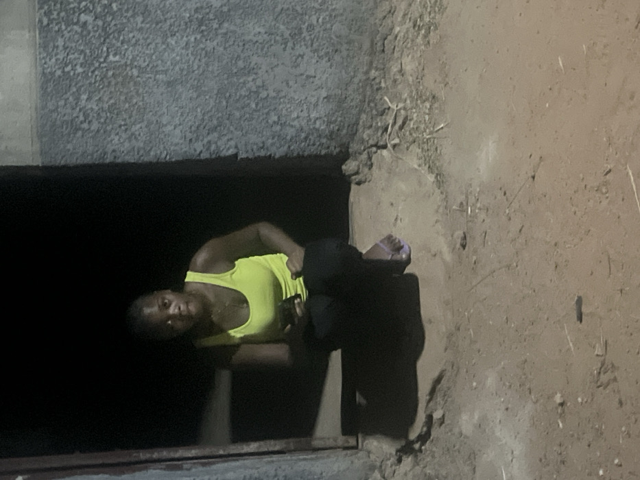 A woman in a neon yellow tank top sits on the edge of a dark doorway. She is wearing black pants and sandals. She faces forward while holding a cell phone in her right hand. The doorway is concrete. The area outside of the doorway is dirt. The scene is dark, but the woman is visible.