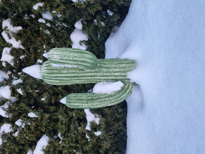 - "The image displays a light green, three-branched decorative cactus sculpture partially buried in fresh white snow" by FM-eDsUh1, licensed under CC BY 4.0