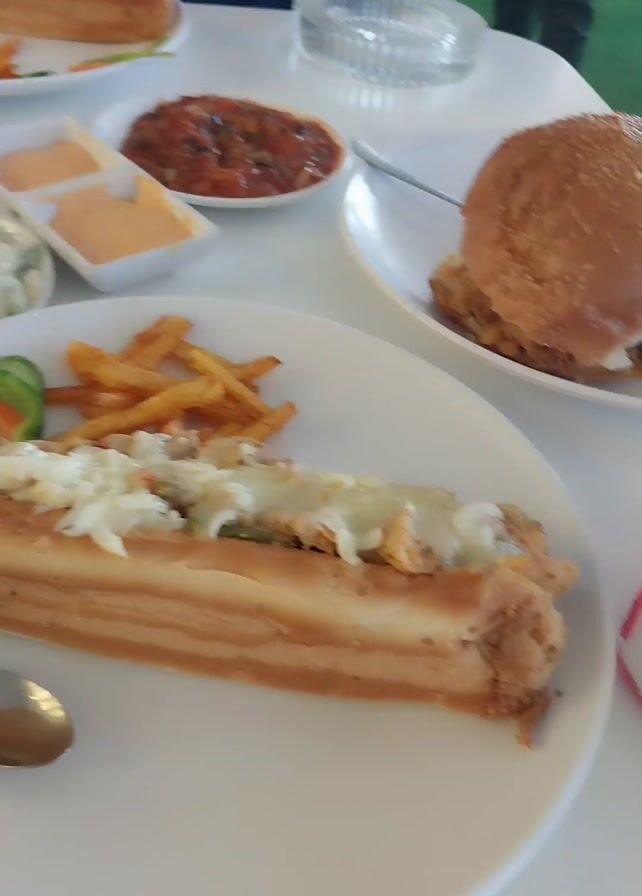 white table with several plates of food. There are four long sandwiches, each cut in half and filled with a creamy white topping. There are also side dishes of fries, salsa, coleslaw, and a white sauce in small containers. On another plate, there is a burger. One person's hands are visible in the lower left corner, holding a phone. The background shows an outdoor setting with green grass.