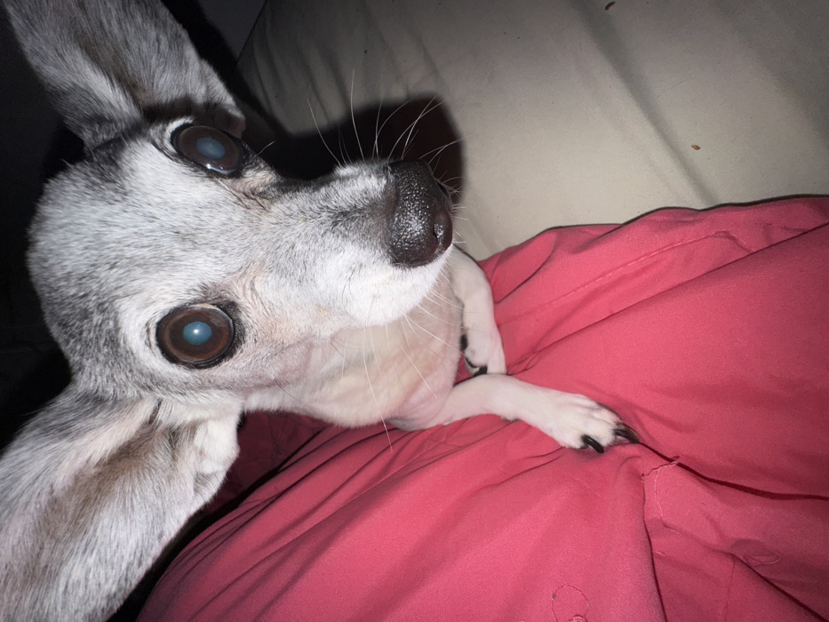A close-up image features a small, gray and white domestic dog, likely a Chihuahua or similar toy breed, positioned on a person's lap. The dog's face and large, erect ears exhibit predominantly gray fur, indicative of age, while its body and legs are lighter, appearing off-white. Its prominent, round eyes are dark brown with a distinct blueish opacity or reflection in the pupils. The dog has a black, moist nose and numerous white whiskers extending from its snout. Its slender front paws, displaying dark claws, rest on a reddish-pink fabric, which appears to be clothing or a blanket. The dog is oriented to face directly forward, towards the camera. The background immediately behind the dog consists of this red fabric, and a lighter, off-white or beige surface is visible to the right. The lighting is direct, creating some shadows. The specific location in the city of Gilboa Regional Council, Israel, cannot be determined from the visual information provided in this image.
