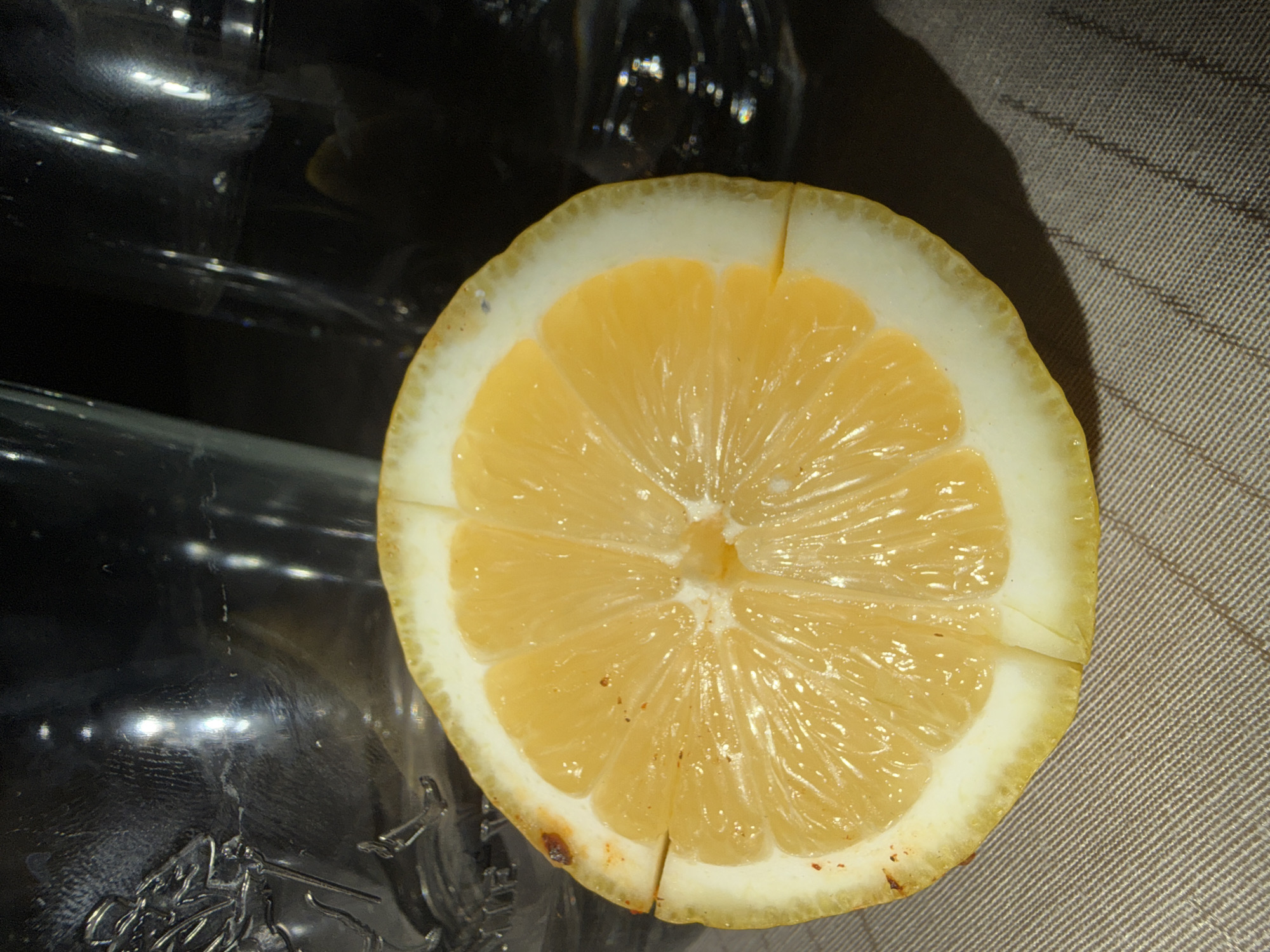 Kavrakirovo, Bulgaria: A close-up image presents a lemon slice, approximately half of a whole lemon, resting on a light-brown or beige textured surface with a discernible diagonal weave pattern. The lemon displays its yellow-orange pulp and white pith, with a minor cut or separation visible in the lower portion of the pith. Small, dark blemishes are present on the lemon's outer edge. In the blurred background, two clear glass vessels are visible. The glass on the left exhibits embossed decorative detailing, while the glass on the right is plainer. A shadow from the lemon is cast onto the surface towards the lower right. No individuals or active interactions are depicted.