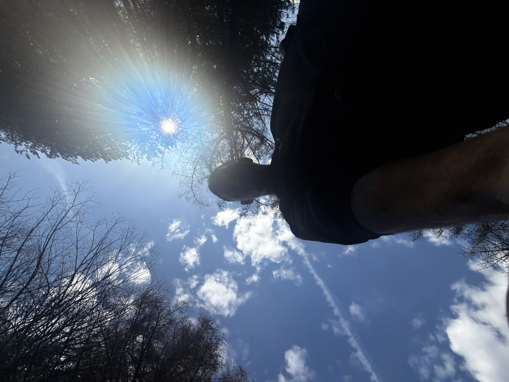 The image, taken from a low angle, shows a person partially obscuring the view of a partly cloudy blue sky. Sunlight shines brightly through the branches of trees, creating a strong glare. Bare tree branches are visible in the lower left of the frame. A faint contrail can be seen in the sky. The location cannot be determined.