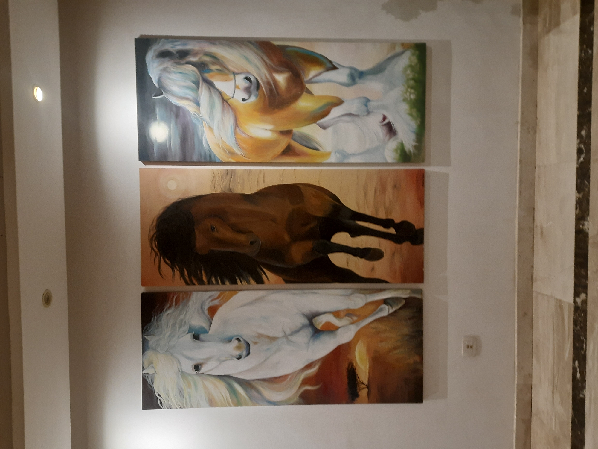 vertical arrangement of three horse-themed paintings on a white wall, potentially in a hotel or residence, likely in Hurghada, Egypt. The top painting features a light-colored horse with flowing mane in shades of white, gold, and brown. The middle painting depicts a brown horse in motion. The bottom painting shows a white horse with a flowing mane against a reddish-brown background. To the left of the paintings is a white wall with an embedded light fixture. To the right is a wall with a marble-like surface featuring vertical dark brown stripes. Below the paintings, on the white wall, there is an electrical outlet.