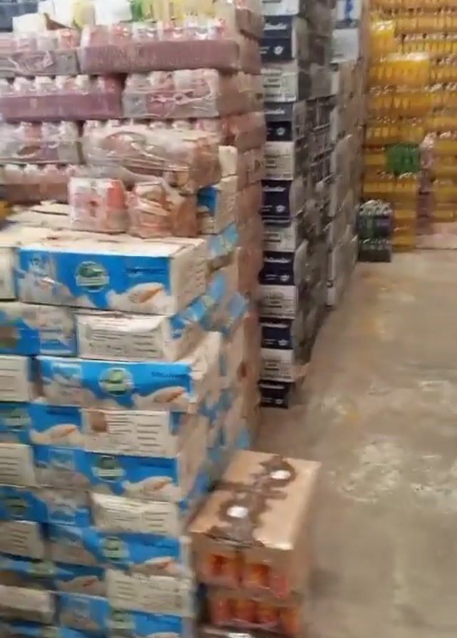 n interior shot of a warehouse stacked with a large quantity of assorted beverages. The beverages are packaged in cans, bottles, and boxes, and are stacked high against the walls and partially into the center of the room. Brands and product names like “Hollandia” and “Veal” are visible on some of the packaging. The floor is concrete. There does not appear to be anyone in the shot.