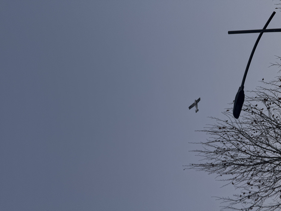 The image displays an outdoor scene in Strasbourg, France, under a clear, deep blue-grey sky consistent with late afternoon or early morning conditions. A light aircraft, appearing to be a single-engine propeller plane, is in flight, positioned in the middle-upper section of the frame, moving from left to right relative to the viewer. The aircraft exhibits a dark silhouette against the brighter sky. In the lower-left foreground, the bare, intricate branches of a deciduous tree are visible, with a few scattered brown leaves clinging to them. To the right, a dark, curved streetlamp pole extends upwards, featuring an elongated luminaire at its apex, with its vertical support pole intersecting the bottom edge of the frame. No individuals or additional subjects are present in the visible area.