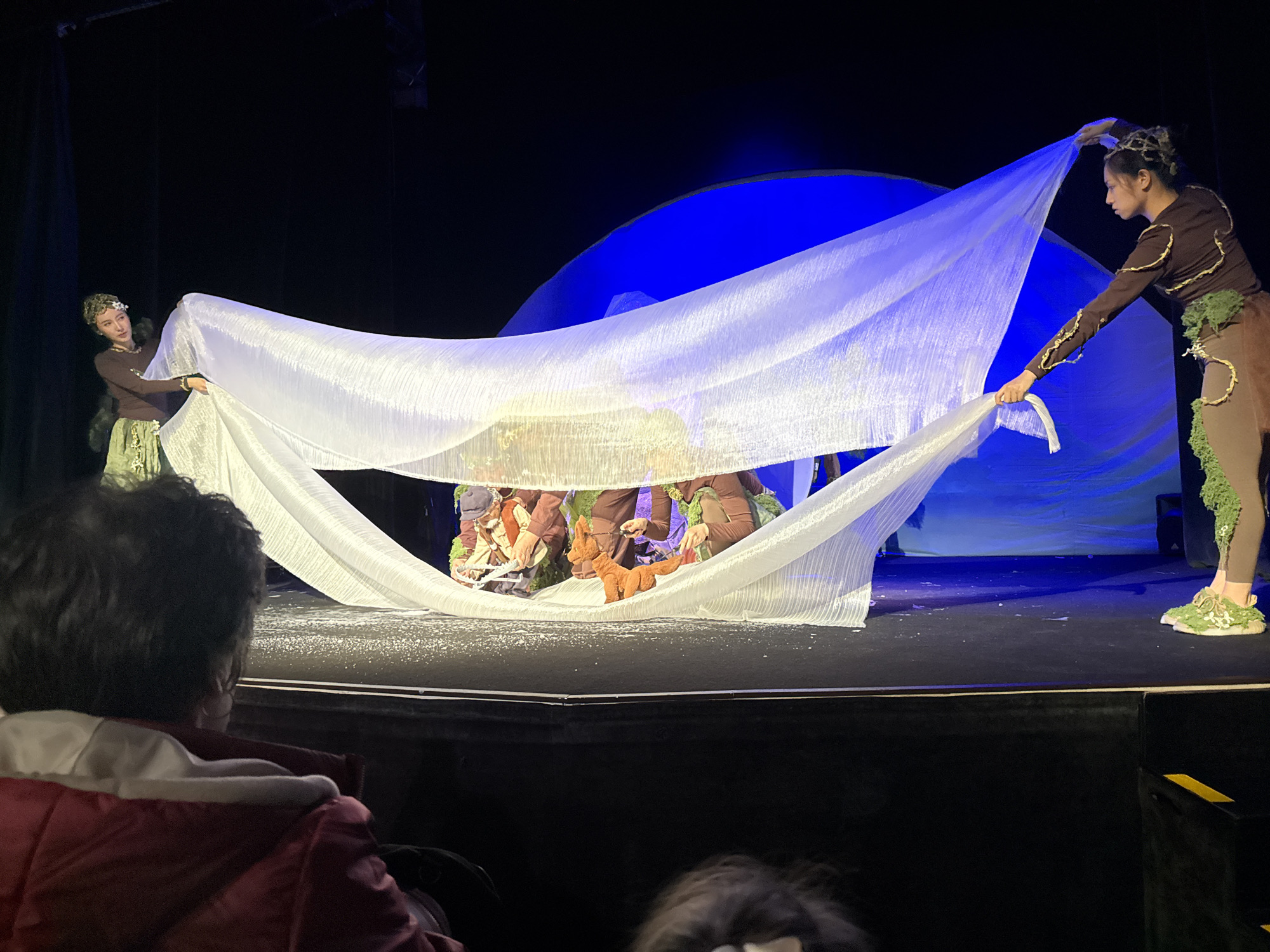 An indoor theatrical performance is depicted from an audience perspective within a theatre in Burgas, Bulgaria. The specific theatre name cannot be ascertained from the image. On a dark, raised stage, two performers manipulate a large, iridescent white fabric sheet. The performer on the left wears a brown long-sleeved top and a green, leafy skirt, with naturalistic adornments in their hair and on their wrists. The performer on the right is dressed in a brown ensemble with green, vine-like accents, including a headpiece and decorated shoes. They are both holding the white fabric taut and high, creating a temporary screen or wave. Behind the white fabric, a scene featuring additional performers or puppets is visible. At least three figures, clad in brown and green costumes suggesting woodland creatures or plants, are positioned on the stage floor, partially obscured. An orange, four-legged animal figure, possibly a fox or squirrel, stands centrally on the stage floor in front of these hidden figures. Scattered white specks, resembling glitter or artificial snow, are visible on the dark stage surface. The background features a curved blue screen or cyclorama illuminated with a strong blue light. Overhead stage lighting equipment is visible in the upper left. In the immediate foreground, from the audience seating area, the back of an individual's head and shoulders, wearing a red padded jacket, is visible, along with the top of another individual's head. The audience area is dimly lit.