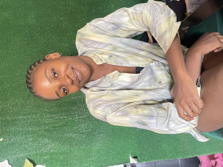 A woman sits on a green surface. She wears a tie-dye shirt with long sleeves. Her hair is styled in neat braids. She has a dark complexion and is smiling, looking directly at the camera. The lighting is bright, highlighting her face and clothing. Part of her upper thigh is visible.