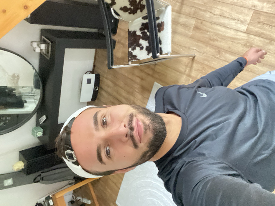 An adult male is depicted in a selfie, taken indoors from a slightly elevated angle