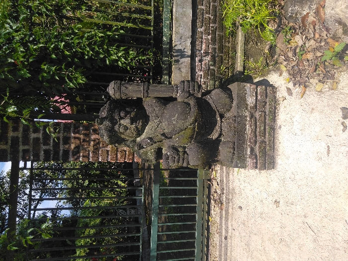 - "The image displays a weathered, moss-covered stone statue positioned centrally, serving as a prominent feature in front of a property gate" by FM-f4dh13, licensed under CC BY 4.0