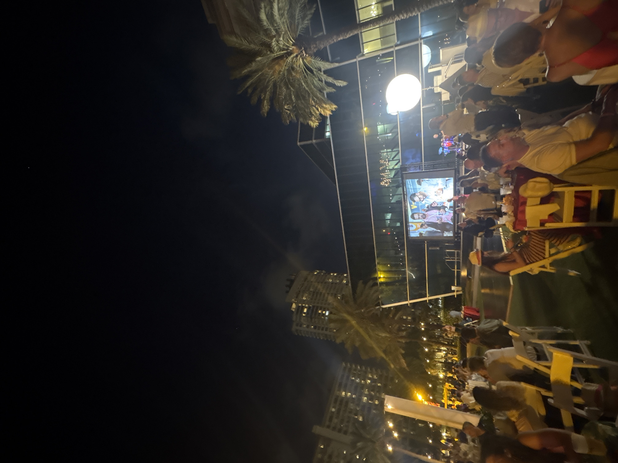 At night, an event takes place outdoors in Miami Beach, United States of America. People are seated at tables, watching a screen. Buildings are visible in the background, with palm trees next to one building. A large, spherical light fixture illuminates the scene. Chairs and tables are arranged for dining. Some people appear to be eating. The setting suggests an organized event, possibly a movie screening or a party.