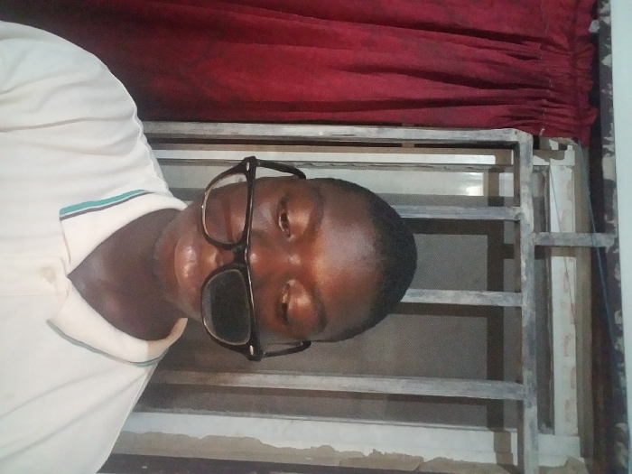 A dark-skinned person wearing glasses and a white shirt with a striped collar poses in front of a window with a metal security grate. The person's head is slightly tilted to the left. The background consists of the grate and what appears to be a maroon curtain hanging above the window. The image orientation is rotated, with the person's left side seemingly closer to the top of the frame. The overall lighting appears dim.