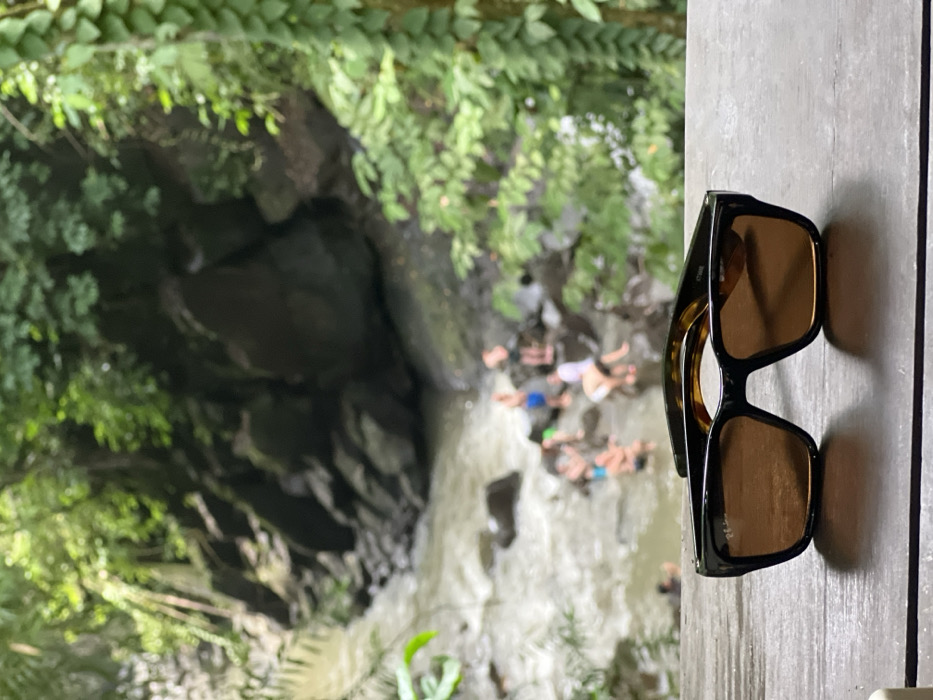 Sunglasses rest on a gray surface, angled to the right. The lens reflects a scene beyond: a rushing waterfall surrounded by dark rocks and vibrant green foliage. Several individuals are seen swimming in the pool at the base of the falls. The scene is captured from a high vantage point, blurring details of both the landscape and the swimmers.