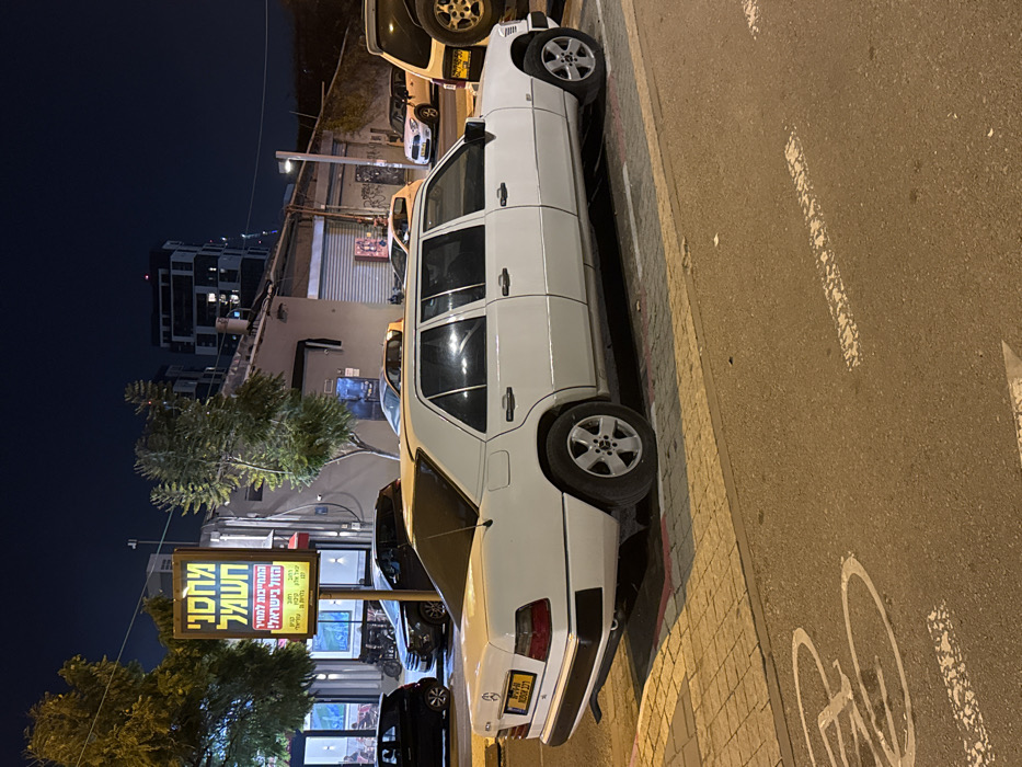 A white Mercedes-Benz limousine is parked on a brick sidewalk, next to a street with painted bike lane symbols. The car's rear is visible, with a license plate in Hebrew. A lit sign in Hebrew stands behind the car. In the background, a street scene is visible at night, with buildings and streetlights. Other cars are parked nearby.