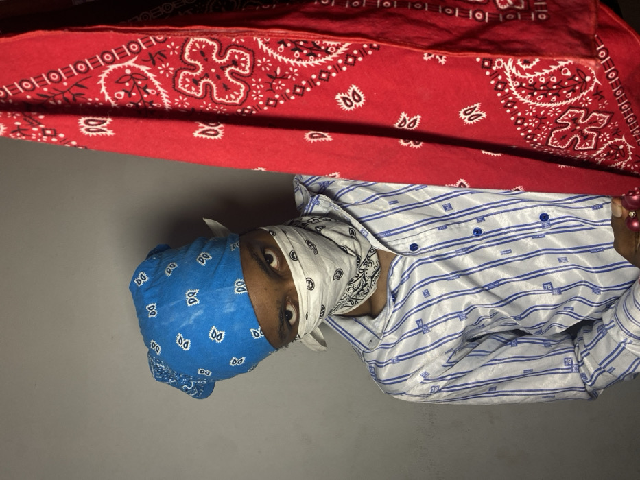 A dark-skinned individual, appearing to be a young adult, is depicted against a plain, light grey wall in Ngleshi Amanfro, Ghana. The person's head is covered by a blue bandana with white, abstract patterns, and the lower face, from the nose down, is obscured by a white bandana featuring black paisley patterns. Only the individual's dark eyes are visible, directed straight towards the viewer. The person wears a light-colored long-sleeved button-down shirt with vertical blue stripes and subtle rectangular motifs; the shirt has blue buttons. On the right side of the frame, a large red fabric, consistent with a bandana featuring white and black paisley and other ornamental designs, is held vertically, partially obscuring the individual's right shoulder and upper torso. A hand, visible at the bottom right, is adorned with red, spherical beaded accessories and appears to be holding the red fabric. The scene is illuminated by direct, frontal lighting.