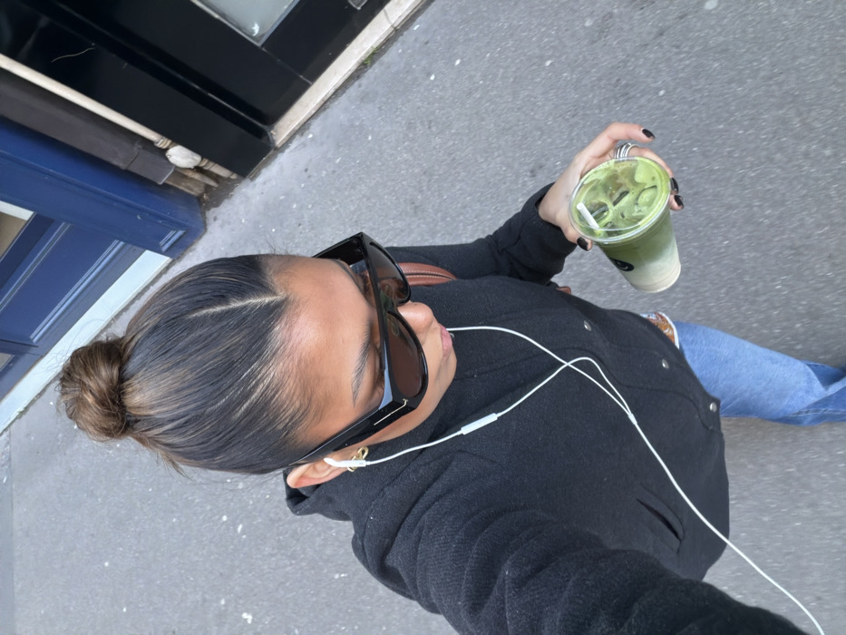 The image depicts an individual observed from a high-angle perspective, walking on a grey urban pavement in a setting consistent with a street in Paris, France. The subject's dark hair with lighter highlights is styled into a sleek high bun with a pronounced central parting. Large, dark, rectangular sunglasses obscure the eyes. White wired earphones are inserted into the left ear. The individual wears a dark charcoal grey jacket with visible snap fasteners and light blue denim jeans. A brown strap, indicative of a shoulder bag, is present over the right shoulder. The right hand holds a transparent plastic cup containing a layered green iced beverage with ice cubes. The fingernails on the right hand are painted a dark color. The background on the right side features a dark blue wooden door frame and a dark building facade with a reflective window and a vertical light-colored downspout.