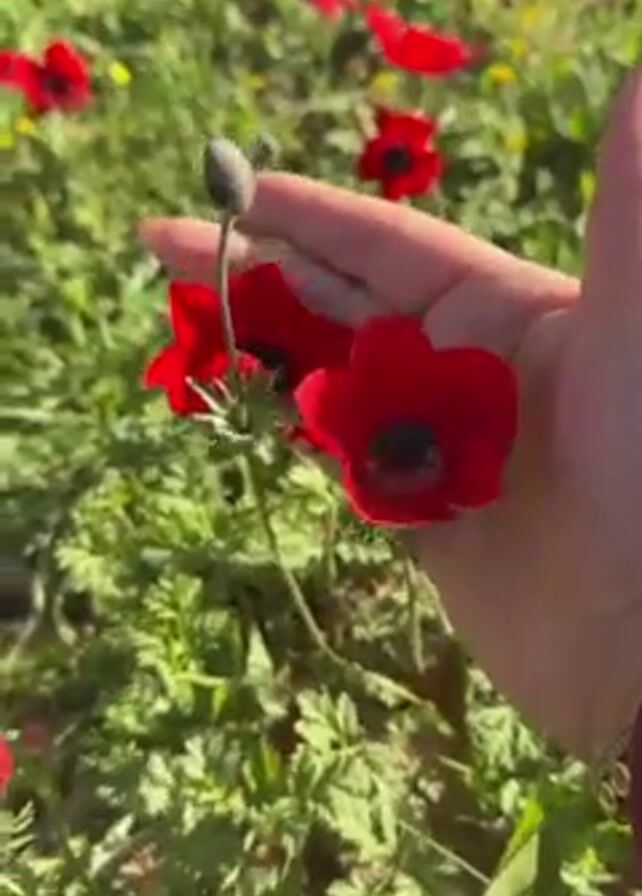 A hand holds red anemone flowers in a field of red anemones. The hand is light-skinned and has a bracelet on the wrist. The anemones have a black center. The flowers are growing in a field of green grass, and there are some yellow flowers mixed in. The ground is partly covered with dry earth. In the background is a tree trunk. The camera moves slightly.