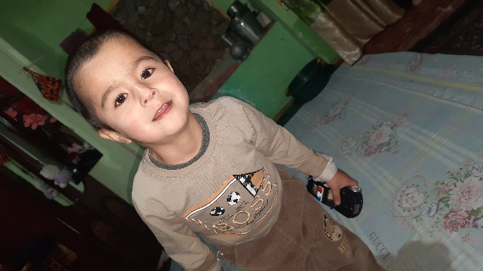 A young child, approximately 3-5 years old, with dark hair and eyes, is depicted from the upper torso, looking forward with a slight smile. The child wears a light tan long-sleeved shirt with a 'BOSS' graphic featuring a soccer ball, over a dark gray collar, and brown trousers displaying a 'GUCCI' logo on the left leg. In the child's right hand is a black toy police car with a white stripe and roof lights. The child is positioned on a light blue fabric covering, possibly a mattress cover, patterned with pink and white roses, green leaves, and diagonal 'GUCCI' branding. The indoor background features dark wooden furniture with several stuffed toys and floral decorations on the left. On the right, a lime green wall section includes a shelf holding dark, indistinct objects, and a dark green container below it. Above the shelf, a section of textured stonework is visible. The image does not contain visual cues to ascertain the specific location as the city of Limbur, Uzbekistan.