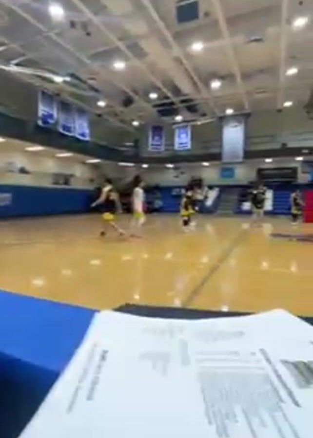 basketball court from the perspective of someone sitting at a scorer's table. The table has a laptop, papers, and other equipment on it. Players in black and yellow uniforms are visible on the court, practicing or warming up. A scoreboard displays the score. The gym has blue accents and banners on the walls. The ceiling has a grid pattern with lights.