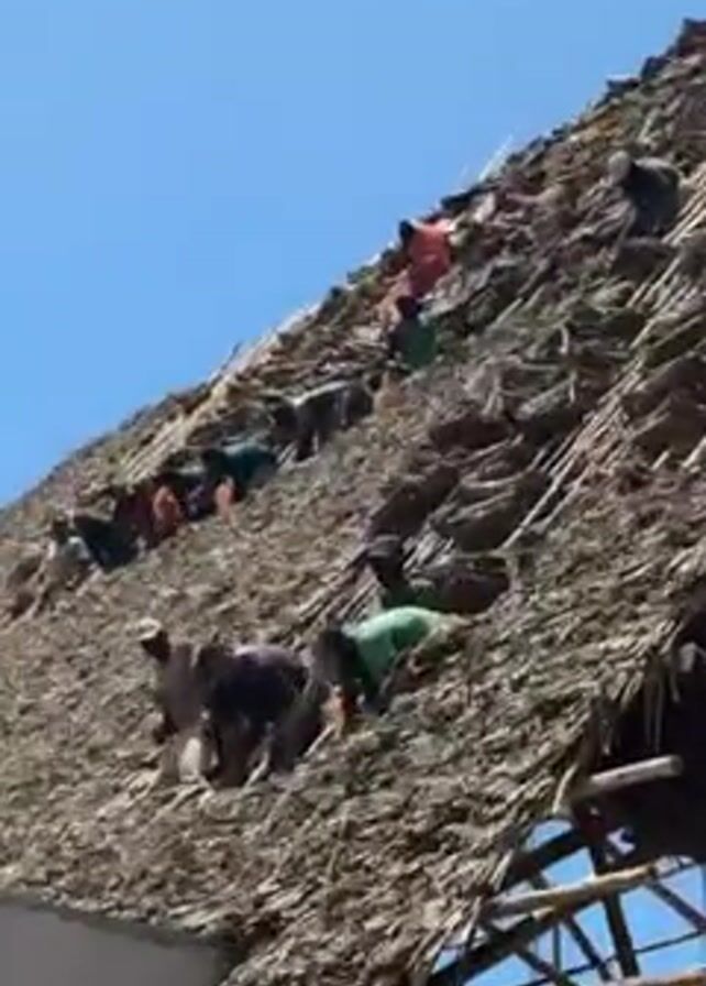 several people working on a thatched roof under a clear blue sky. The roof is steep and made of dried palm leaves, with some sections missing revealing the wooden frame beneath. The workers, dressed in various casual clothing, are seen climbing and moving around on the roof, seemingly repairing or constructing it. The camera is positioned below, looking up at the roof, and it appears to be slightly panning or zooming. A stone wall is visible in the foreground, marking the boundary of the property. Overhead power lines are also present, crossing the sky above the roof.