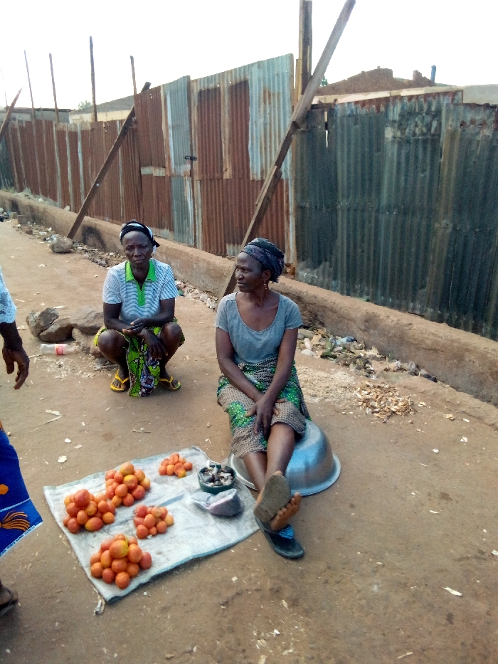 Two women are seated outdoors next to a makeshift corrugated iron fence. One squats, wearing a green and white striped shirt and yellow sandals, while the other sits on an upturned metal bowl, dressed in a gray top and patterned skirt. Between them, a white cloth displays piles of tomatoes and a small container of unknown food. A partial view of another person's clothing is visible at the lower left. The ground appears bare and dusty, littered with debris.