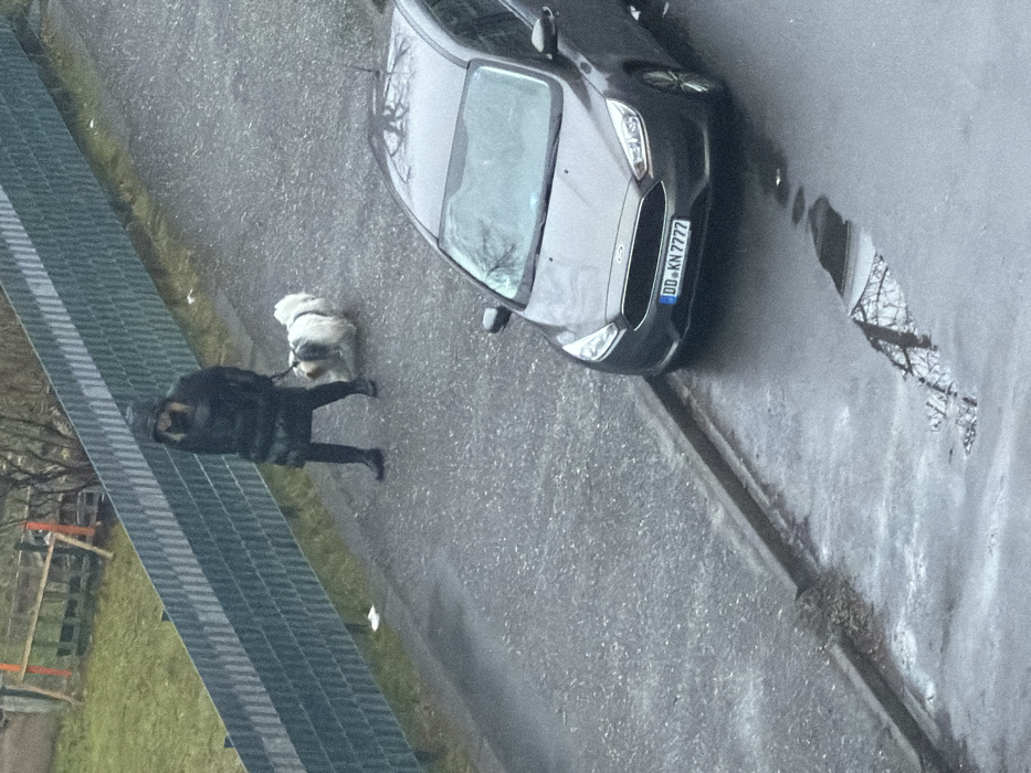 - "An overhead shot depicts a person walking a white dog on a leash next to a gray car parked on a wet street" by FM-87sX52, licensed under CC BY 4.0