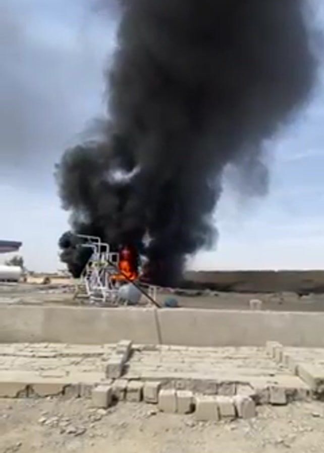 large fire with thick black smoke billowing into the sky. The fire is centered around a structure with metal piping and what appears to be a tank. The structure is on a concrete slab surrounded by loose soil and debris. The sky is partly cloudy, and in the background, there's a low-lying building or structure. The fire is substantial, with visible flames consuming the structure.
