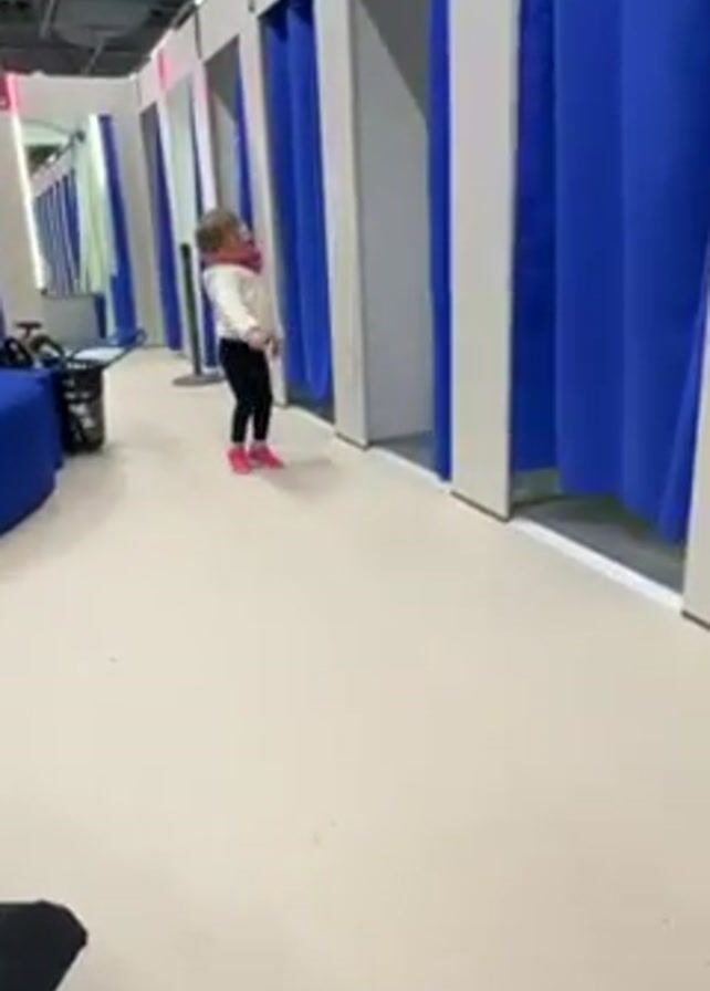 A small child with blonde hair, wearing a white jacket, black pants, and pink shoes, walks along a row of dressing rooms with closed blue curtains. The dressing rooms are separated by white partitions and have small red lights above the doors. The floor is off-white. In the foreground is a blue bench with a black jacket and hood placed on it. A person is sitting on a similar blue bench in the background, near a blue shopping cart. The ceiling is visible and has exposed pipes. The scene appears to be inside a store or retail space.