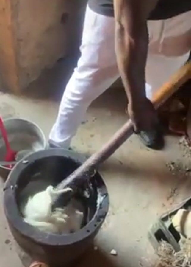 A person wearing white pants and a black shirt is mashing something in a dark, wooden mortar with a long wooden pestle. Steam is rising from the mortar. To the left of the mortar is a metal pot with a red spoon inside. Another person’s feet, wearing white sandals, are visible in the bottom left corner of the frame. The background appears to be a simple, possibly unfinished or older structure, with rough walls.