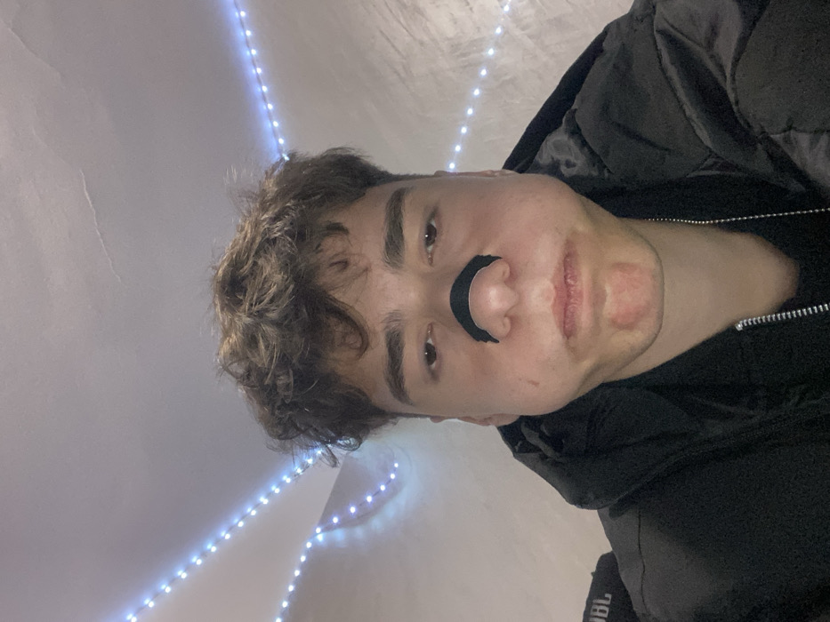 A young adult male, with light skin, short, dark curly hair, and dark eyes, is depicted from the chest up in an indoor setting. He wears a dark, possibly black, zipped puffer jacket over a dark undershirt, with a metallic chain visible around his neck. A black nasal strip or tape is affixed horizontally across the bridge of his nose. His cheeks are noticeably distended, consistent with holding air in the mouth, and a reddish, rectangular mark is present on his chin. He looks directly at the camera. The background consists of a light-colored wall and ceiling adorned with irregularly strung blue LED lights. A dark object partially labeled "JBL" is visible to the lower left. The specific location within Troyan, Bulgaria, is not discernible from the visual information provided in the image.