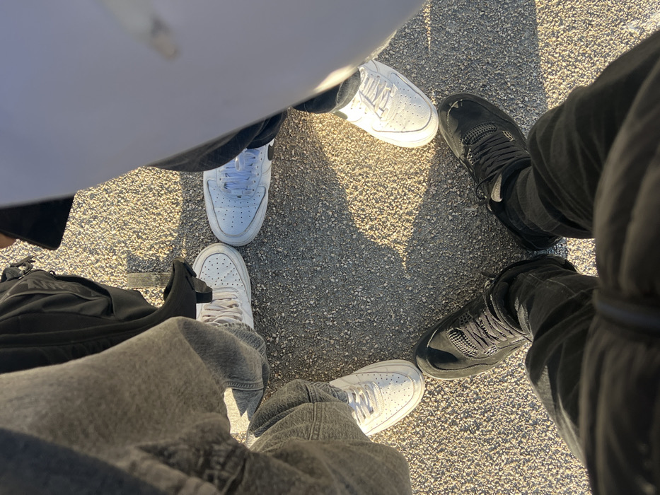 The scene depicts a top-down view of four individuals' lower legs and feet, forming a partial circle on a coarse-grained asphalt surface in Bischheim, France. Sunlight illuminates the ground from the left, casting shadows to the right of the subjects. Three individuals wear white low-top sneakers, specifically Nike Air Force 1 style footwear. The person in the bottom-right, whose perspective the image is taken from, wears black high-top sneakers, appearing to be Jordan 4s, paired with black trousers. The individual to the top-left wears light grey trousers, and a black backpack is visible behind their leg. The individual to the bottom-left wears dark grey trousers. A fourth individual, positioned top-right, has their upper leg obscured by a light-colored garment. A thin, light-colored linear object lies on the ground between the top-left and top-right shoes. The feet are oriented inward, suggesting a group standing in proximity.