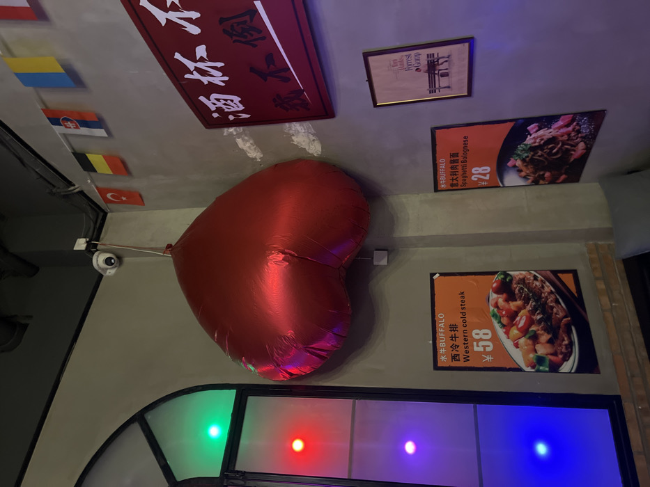 The image displays an interior corner of a commercial establishment, likely a restaurant or bar, situated in Wenjiang District, China. The environment consists of light gray walls and a partially visible dark ceiling with exposed conduits. A large, metallic red, heart-shaped balloon is centrally suspended from the ceiling. Above it, a white dome-shaped CCTV camera is mounted high on the wall. To the upper right, a string of small national flags, including those of Turkey, Belgium, Slovakia, and others, hangs along the wall. On the upper right wall, a large red rectangular sign features Chinese characters translating to "The wine glass doesn't fall, I don't fall." Below this, a framed picture resembling a movie poster for *Forrest Gump* is mounted. Two rectangular food promotional posters are affixed to the lower wall. The left poster advertises "BUFFALO Western cold steak" (西冷牛排) for ¥58, accompanied by an image of the dish. The right poster promotes "BUFFALO Spaghetti Bolognese" (意大利肉酱面) for ¥28, also with a photograph of the food item. On the far left, a vertical structure resembling a window or decorative panel displays distinct colored lights: green at the top, red in the middle, and purple and blue towards the bottom. A gray upholstered cushion, indicating seating, is partially visible in the bottom right foreground. No individuals are present within the frame.