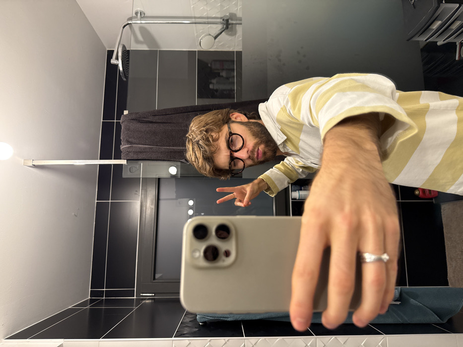 This image captures a mirror selfie taken by a male subject in a modern bathroom located in Chambœuf, France