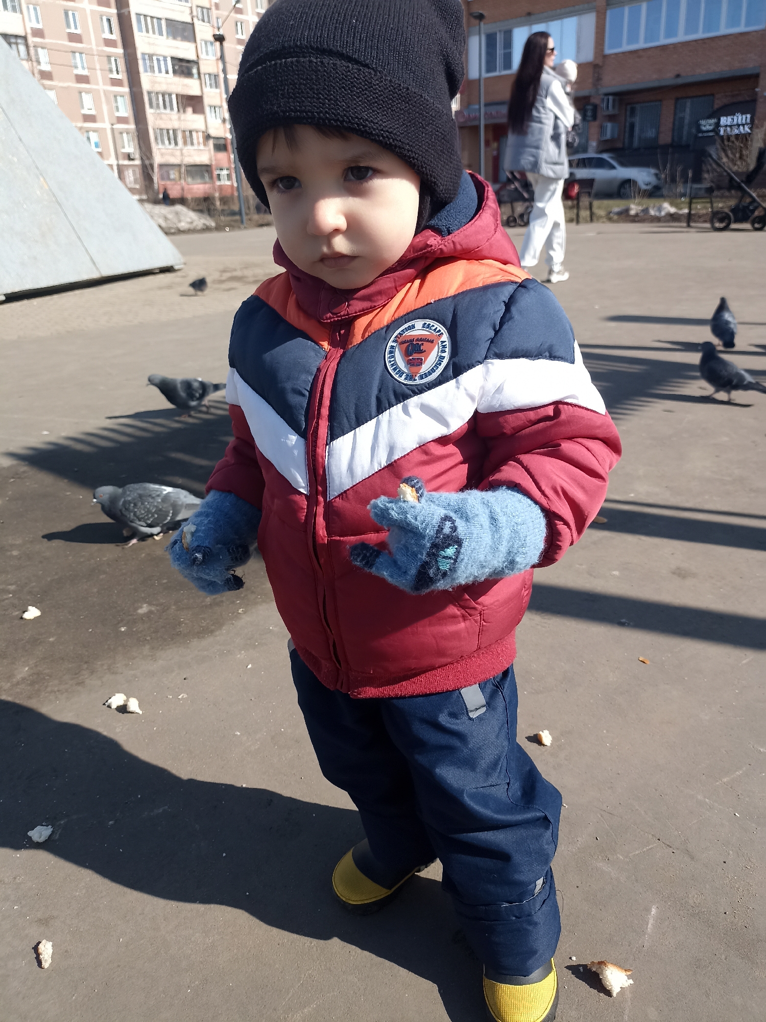 An outdoor urban scene in Serpukhov, Russia, on a bright day. The foreground features a young child, approximately 2-4 years old, standing centrally, angled slightly to the viewer's right. The child wears a black knitted beanie, a red, white, and navy blue puffer jacket with a circular patch on the left sleeve, dark blue trousers, and yellow and black boots. Both hands are covered with light blue mittens adorned with a butterfly design; the left hand holds a small piece of light-colored bread or food. The child is positioned on a grey, paved surface, likely asphalt or concrete, where several pieces of similar food are scattered. At least five dark-feathered pigeons are visible on the ground around the child and further back, interacting with the scattered food, suggesting the child is feeding them. Long shadows are cast across the pavement from the left. In the mid-ground to background on the left, a large, light-colored triangular or pyramidal structure is partially visible. Behind it, a multi-story residential building with a beige or light brown facade and numerous windows indicates an urban residential area. In the background on the right, a woman wearing a light grey vest and white trousers is seen walking away from the camera, carrying an infant or small child. Behind her is a commercial building with large rectangular windows and a red-brown brick-like facade. A sign on this building prominently displays the Cyrillic text "ВЕЙП ТАБАК" (VAPE TOBACCO). A dark-colored stroller is parked further back on the right, and a silver car is partially visible.
