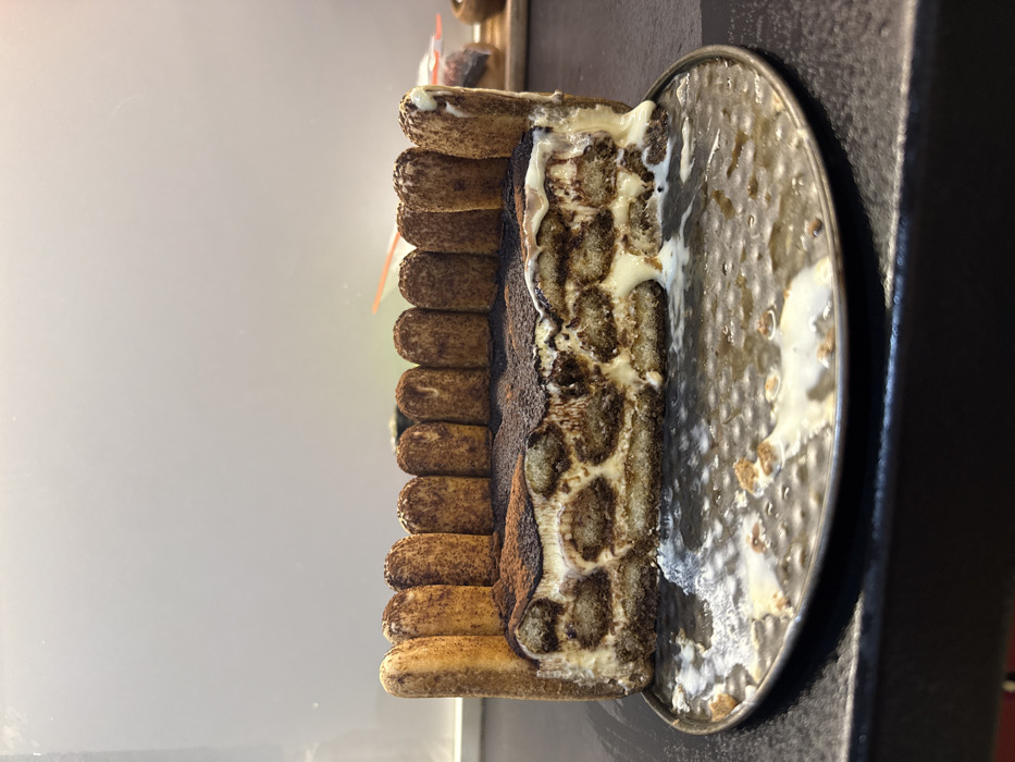 - "A rectangular tiramisu dessert is centered on a dark, circular, textured plate" by FM-CCOQt1, licensed under CC BY 4.0