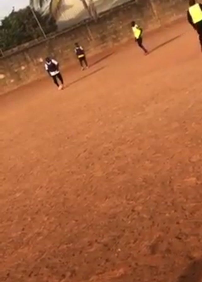 soccer practice on a dirt field. Four people are visible, three wearing yellow reflective vests and one wearing a white shirt with blue trim. One person is dribbling a soccer ball. A concrete wall lines one side of the field with a wire fence extending upward from the wall. A palm tree is also visible beyond the wall.