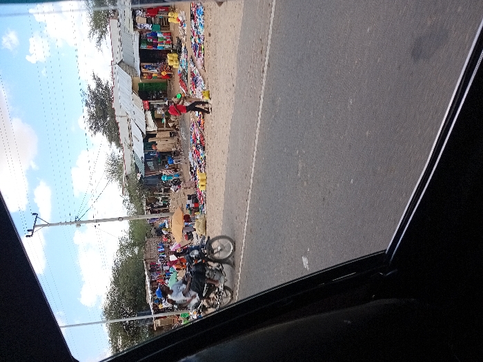 A roadside view from inside a vehicle shows a street lined with makeshift shops