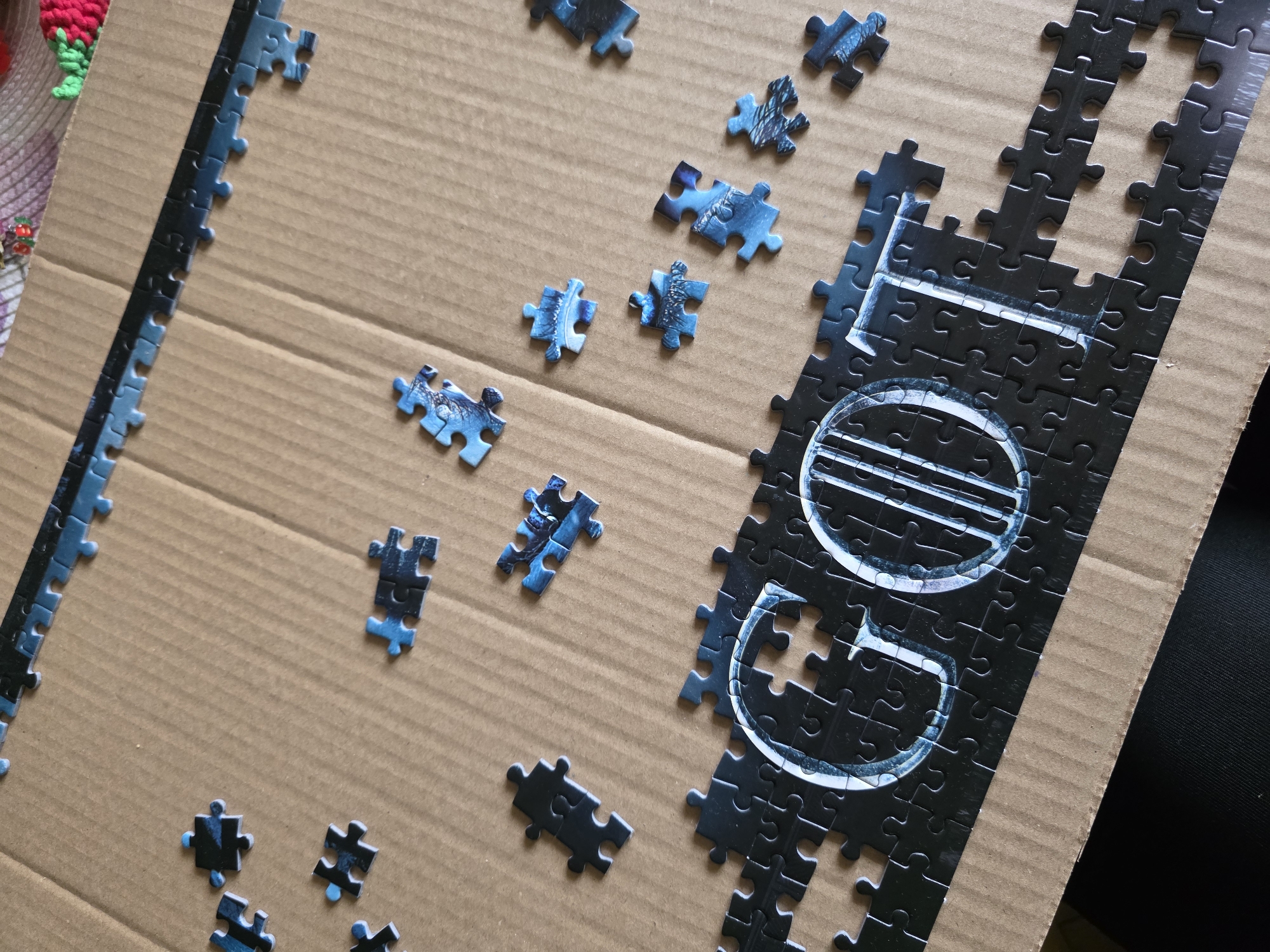 jigsaw puzzle, mostly incomplete, on a brown corrugated cardboard surface. A section of the puzzle, comprised of black and dark blue pieces, spells out the word "GOT" in white. Several unattached pieces of the puzzle are scattered around, some predominantly blue and others black. A completed edge of the puzzle lies to the left. Parts of what appears to be a pink knitted strawberry and green leaf are in the upper left corner. The location is not evident from the image and no information about Stara Zagora, Bulgaria is present.