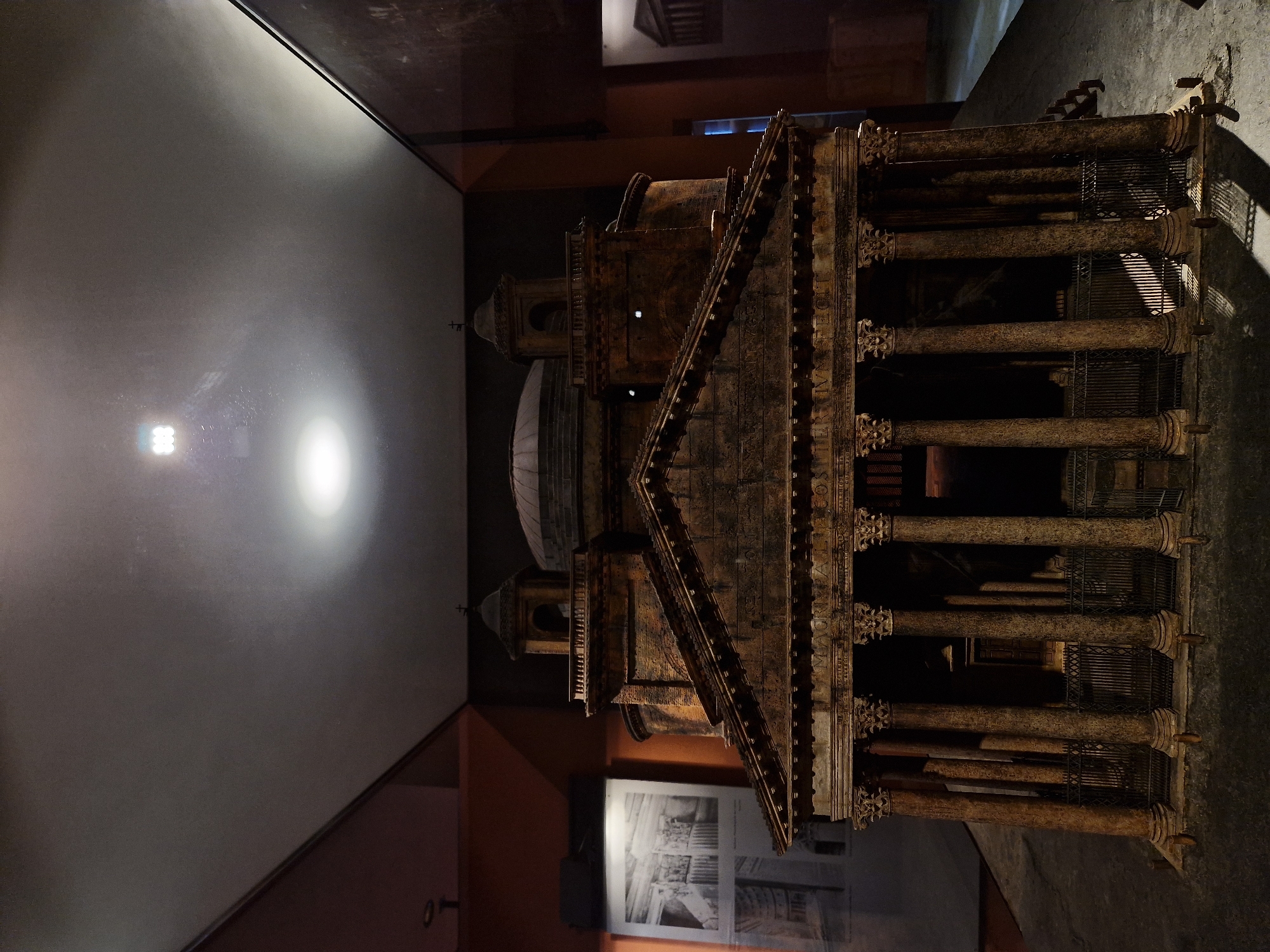 - "An intricate, dark bronze-toned architectural model of a classical Roman building is centrally displayed in a dimly lit indoor exhibition space in Aschaffenburg, Germany" by FM-IGD033, licensed under CC BY 4.0