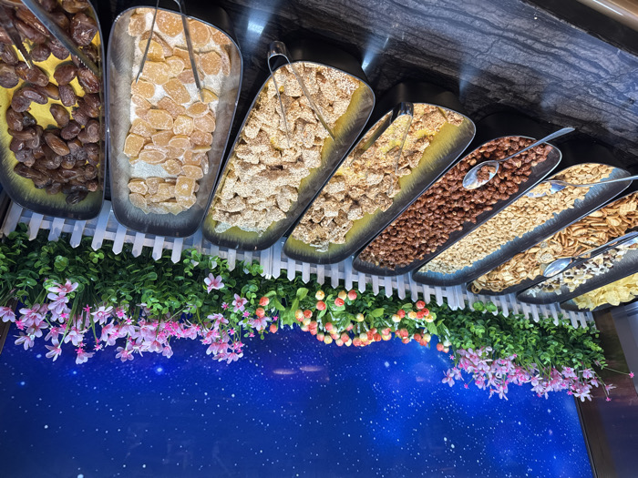 The scene depicts a self-service food display within a facility in Mondeville, France. Nine oblong metal serving trays are arrayed on a dark, marbled countertop. From left to right, the contents are: yellow potato chips (partially visible); a mixed assortment of crackers and snacks with a silver spoon; light brown elongated nuts with a silver spoon; shelled peanuts with a silver spoon; dark brown coated peanuts with a silver spoon; two distinct trays containing irregular sesame-coated brittle pieces, each with silver serving tongs; circular candied ginger slices dusted with sugar, served with silver tongs; and dark brown dates, with silver tongs (partially visible). Above the food line, a white picket fence fronts artificial floral arrangements—pink and lilac blooms on the left, and red and orange blooms on the right. A deep blue panel with white speckles, simulating a starfield, forms the upper background. No persons are visible.