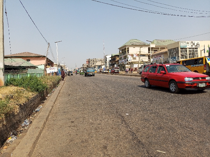 The image displays an urban street scene in Dadi Riba, Nigeria, observed under a clear, bright sky