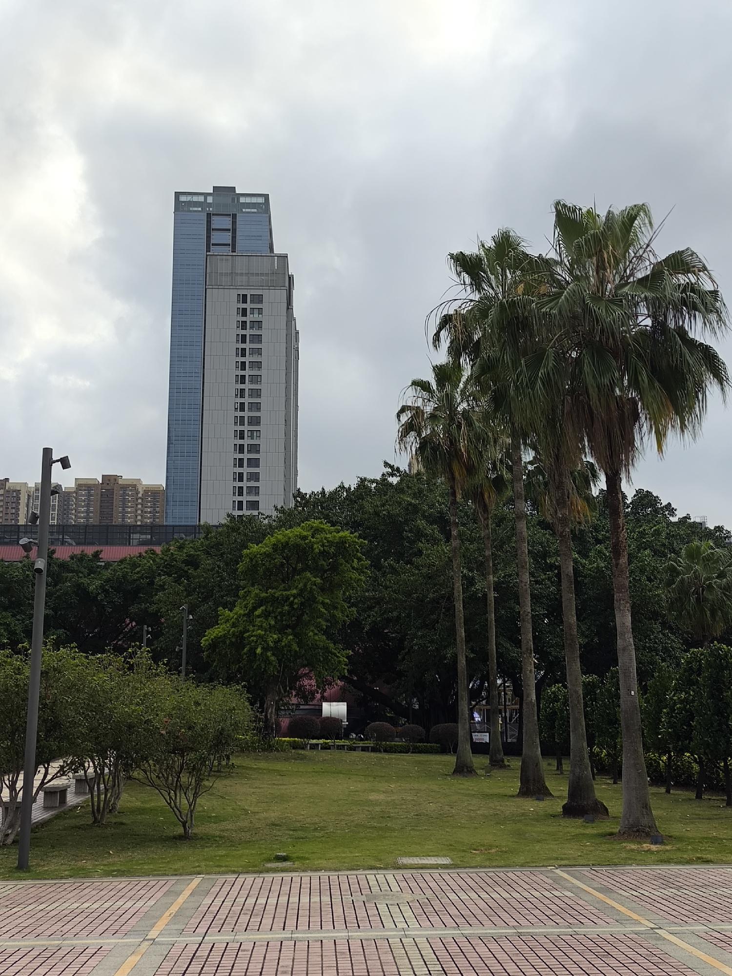 The photo shows a public park in Longgang District, China. In the foreground, there's a brick-paved area leading to a grassy lawn. Several palm trees stand along the right side of the lawn. Behind the lawn, there's a line of dense green trees. A tall, modern building with a glass facade and a lighter-colored concrete section rises in the background. Other buildings are visible behind the dense greenery. The sky is overcast and grey. There are no people visible in the scene. Street lights are visible along the left side of the image.