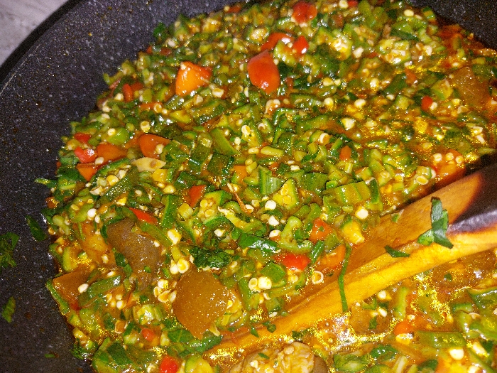 A close-up shot shows okra soup, potentially Nigerian Okra Soup or a similar dish