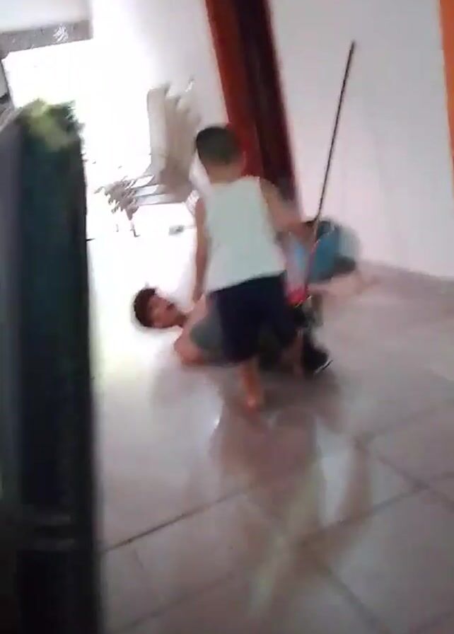A young child in a white tank top and dark shorts is shown standing over an adult laying on the tile floor. The child is standing near the adult’s head and is moving his arms. The child then kneels on top of the adult while continuing to move his arms. A mop is on the floor to the right of the scene. A black chair is partially visible on the left side of the scene.