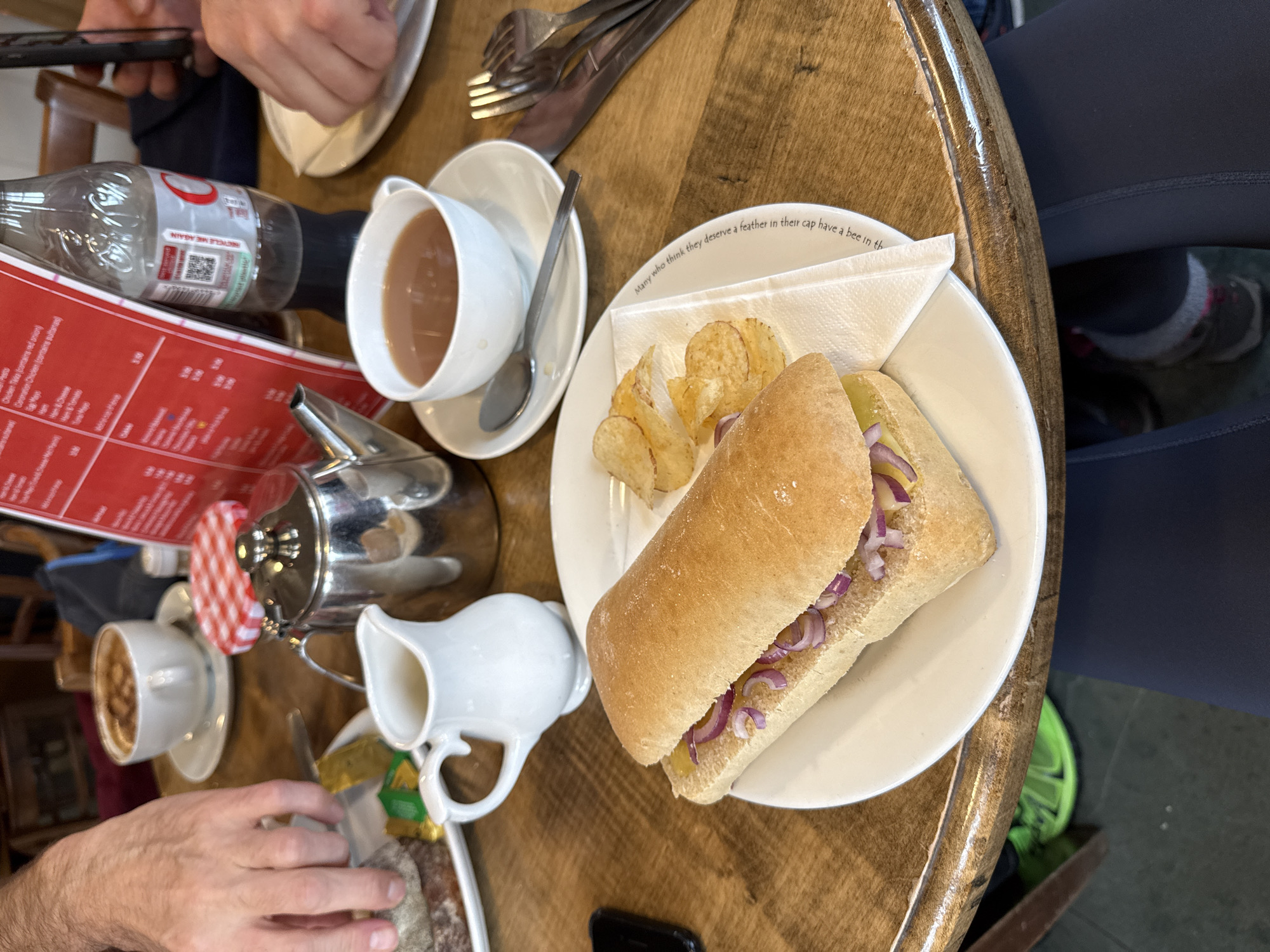The image captures a high-angle view of a café table setting, likely in Bowness-on-Windermere, United Kingdom, based on the cafe's aesthetic. The table is made of wood. Various items are arranged, including a plate with a sandwich filled with red onions, potato chips, and a napkin, alongside a cup of tea on a saucer with a spoon. A silver teapot with a red-and-white checkered lid and a white milk jug are also present. A red menu is visible. In the background, parts of two people are visible: one with a hand reaching for the table items and another with legs wearing dark leggings and sneakers. A bottle of water and cutlery can also be seen on the table.