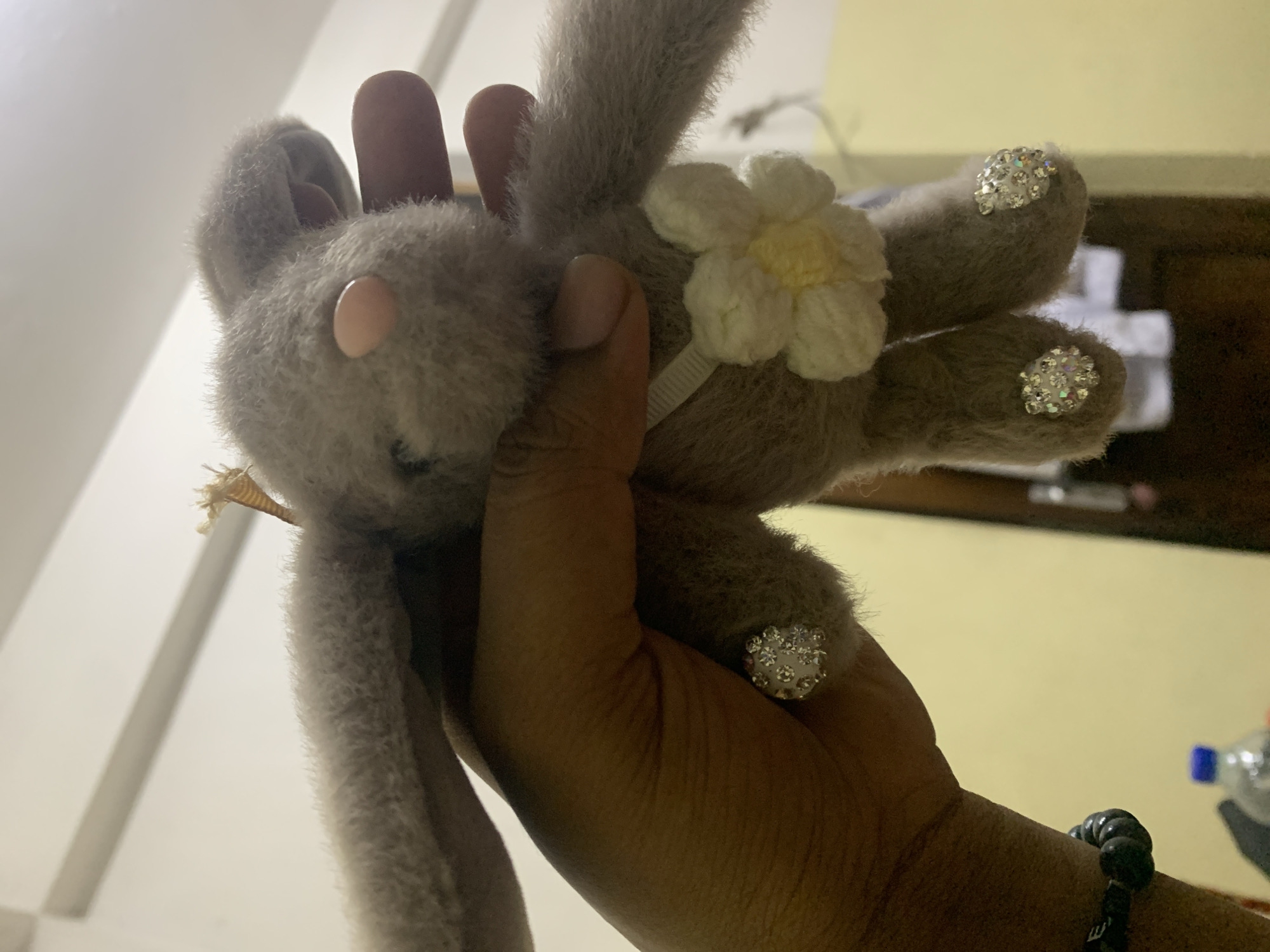 A person is holding a gray, plush toy rabbit in their hand. The rabbit has a flower attached to its neck and decorative stones on its paws. The background is blurry, but it appears to be an indoor setting with a wall and some objects. No information in the image confirms the location is Dar es-Salaam, Tanzania.
