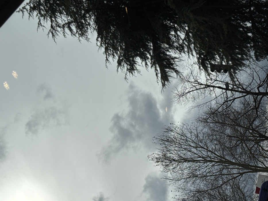 The scene depicts an overcast sky over Oberhausbergen, France, characterized by a uniform light grey cloud cover. In the foreground, several bare deciduous trees with intricate branch networks occupy the left and center-left sections. A dense, dark green evergreen tree with needle-like foliage dominates the right side of the frame, extending from the bottom to the top edge. A dark, three-section traffic light signal head is partially visible on the lower right, suspended amidst the evergreen branches. Near the top edge, two distinct bright, rectangular light reflections or sources are visible against the cloudy sky. Another horizontal, oval-shaped light source or reflection appears in the mid-ground clouds, slightly left of center. A small, cropped portion of a blue object and a red object is visible at the very bottom left corner. No individuals or discernible actions are present.
