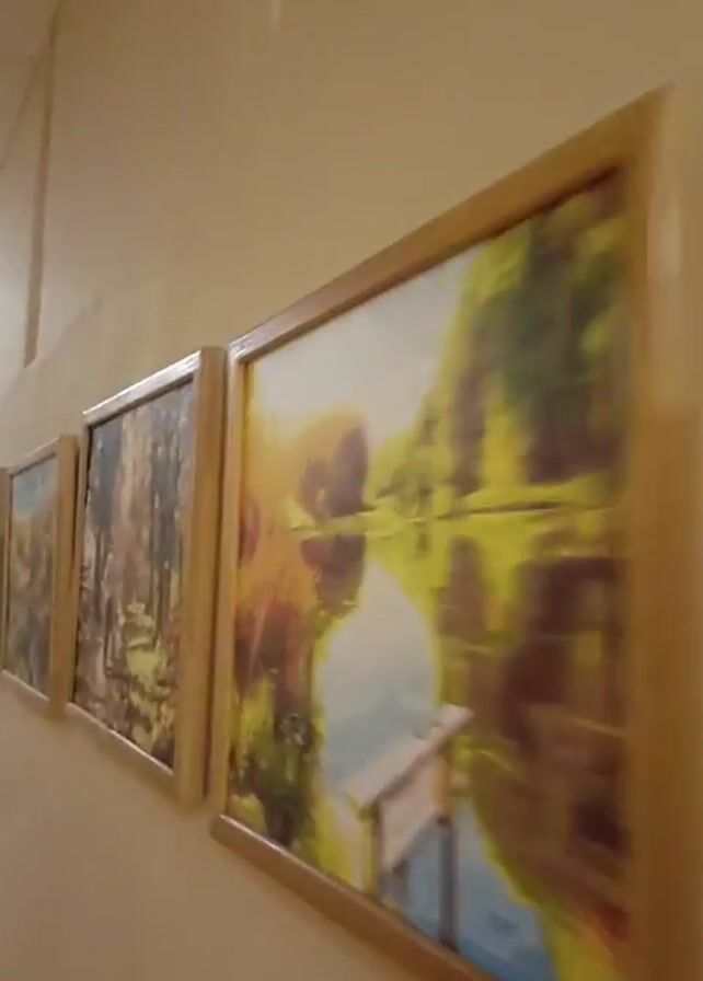 series of framed landscape paintings hung on a beige wall along a hallway. The camera moves quickly, blurring the details of the artwork, but the paintings appear to depict various scenes, including landscapes with trees, water, and buildings. The frames are wooden. At the end of the video, the camera focuses briefly on a painting featuring a building covered in flowers. A blue cabinet is visible in the background.